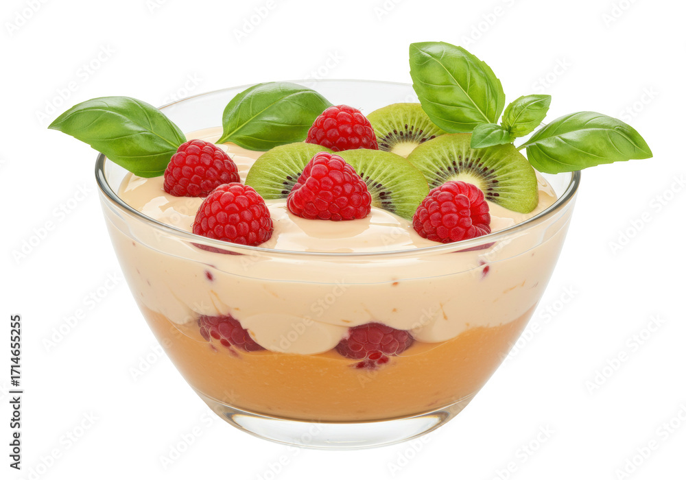 Isolated bowl of trifle dessert with raspberries, kiwi slices, and basil, delectable and gourmet
