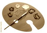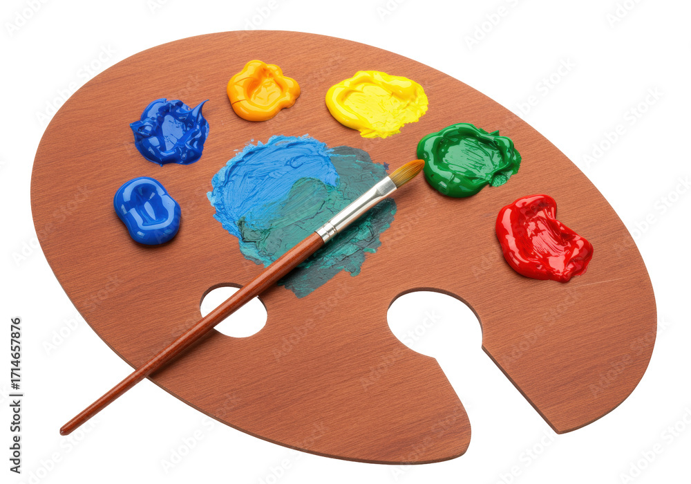 Isolated painters palette with blobs of color, paintbrush laying across paints, art supply
