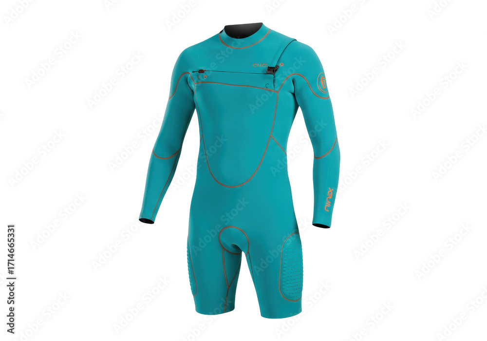 Isolated teal wetsuit for surfing and water sports, technical clothing in studio shot
