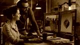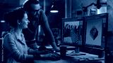Female Game Developer Has Discussion with Male Project Manager While Working on a Game Level on Her Personal Computer with Two Displays. They Work in a Modern Loft Office Creative Environment.