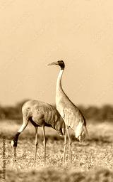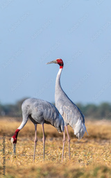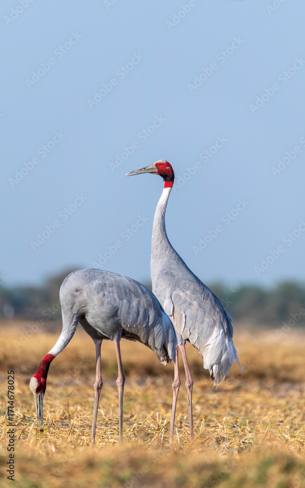 A pair of Sarus cranes feeding on the ground on the outskirts of Nalsarovar lake area in Gujarat, India