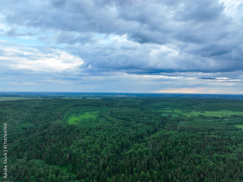 A panoramic aerial shot of a vast, dense green forest stretching to the horizon, with a small lake and a village visible in the distance.