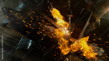 Close-up of blacksmith forging glowing hot iron on anvil with flying sparks