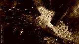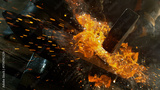 Close-up of blacksmith forging glowing hot iron on anvil with flying sparks