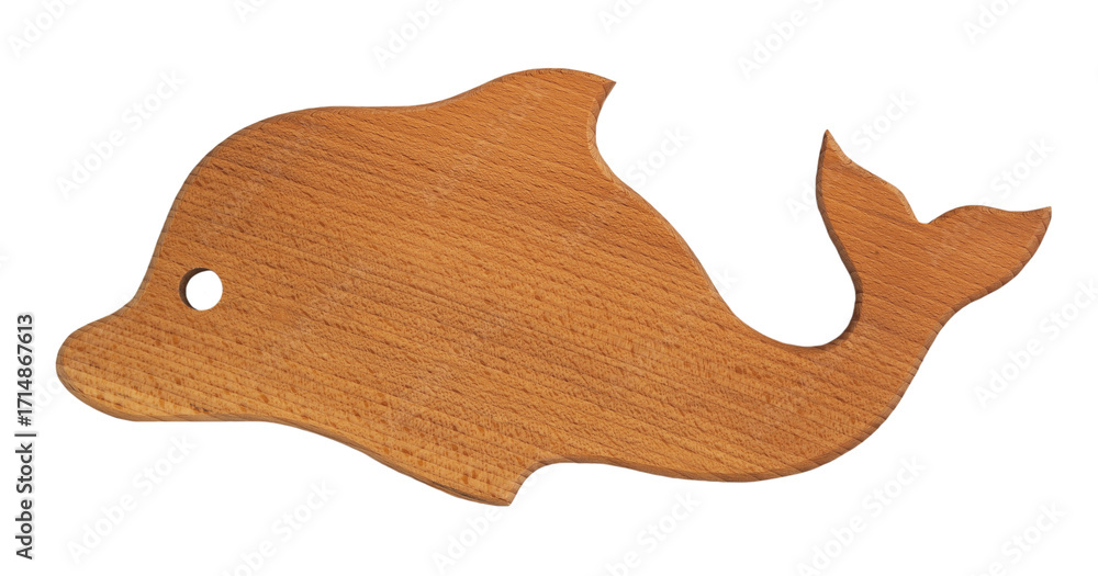 Top view of a wooden cutting board in the shape of a dolphin on a transparent or white background. PNG.