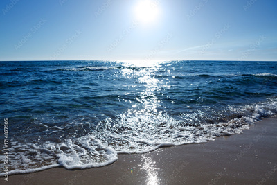 Sandy beach with blue sky and turquoise water ,as holiday summer background.