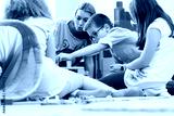Cute pre-school boy cooperating with his colleagues at the construction of a structure, made of wooden toy blocks under the guidance of a young kindergarten teacher