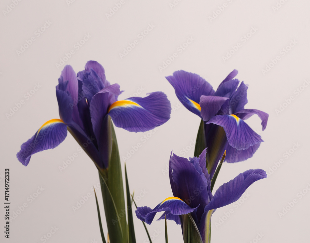 Close-up Violet, blue, yellow Iris Flower bouquet on beige gray. Minimalist still life. Natural background.