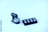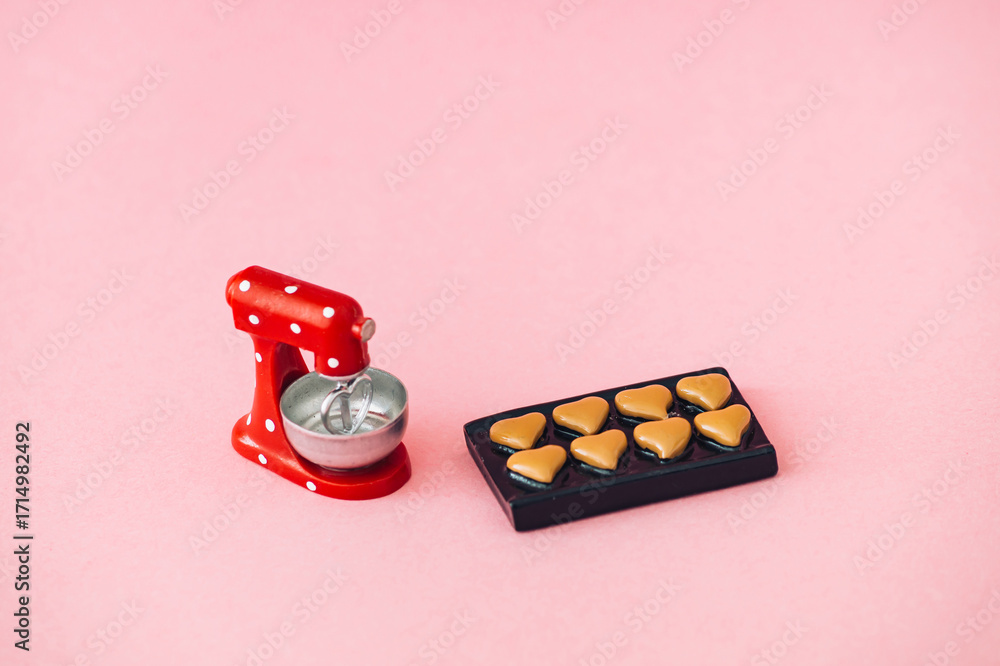 Mini stand mixer model with heart shaped cookies on pastel pink background. Minimal creative kitchen mixer with biscuits concept. Trendy sweet food idea.