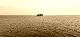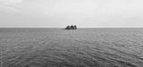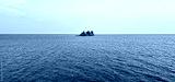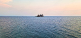 Tranquil seascape at sunset with a small rocky island covered in trees in the distance, surrounded by calm blue waters under a pastel sky. Petrovac, Montenegro-