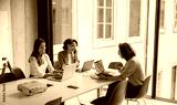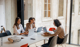 Three skilled professionals are in a productive and interactive meeting in a vibrant office environment