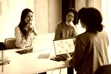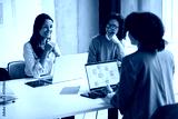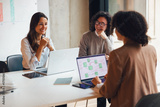 A diverse and dynamic team is actively engaged in a productive discussion while using laptops during their meeting