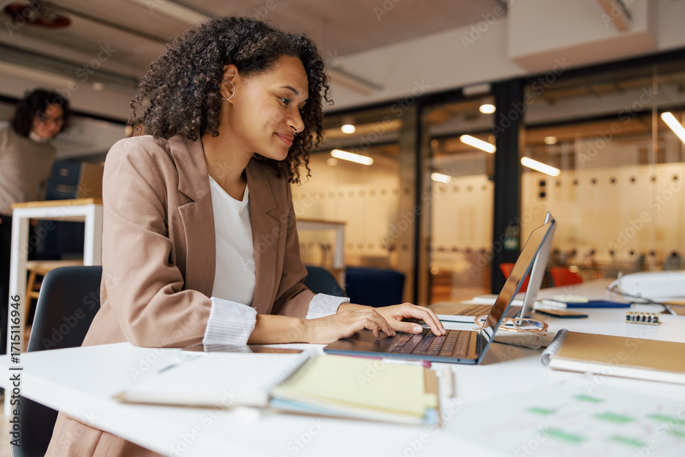 A dedicated and focused professional woman is utilizing her laptop effectively in a chic and stylish workspace