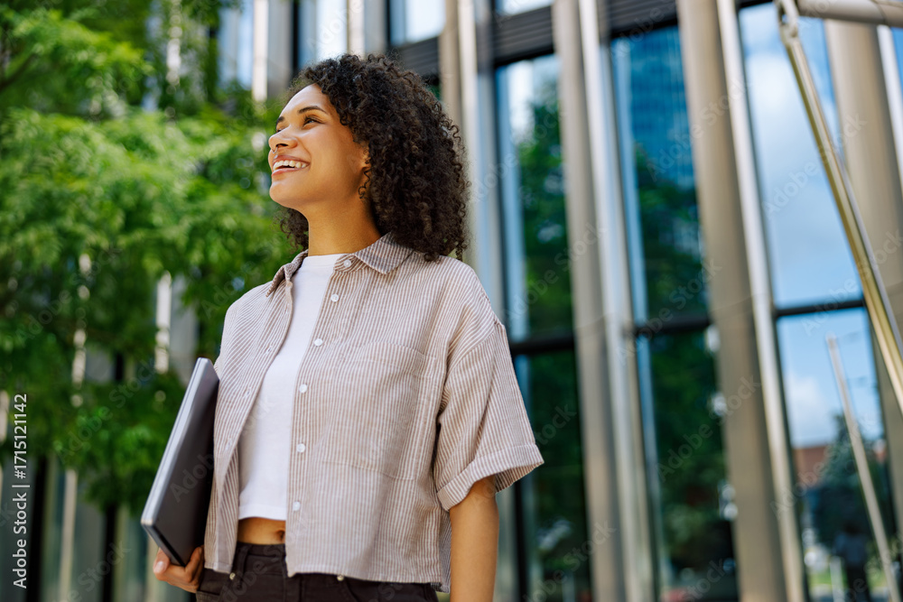 A smiling young woman stands confidently outside a sleek, modern building, holding her laptop with pride