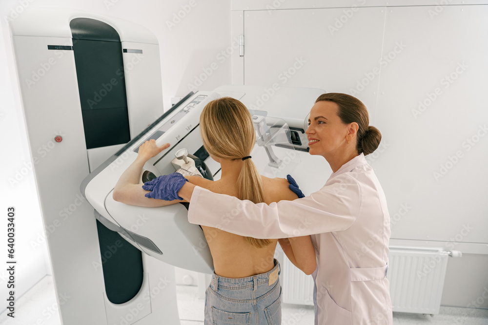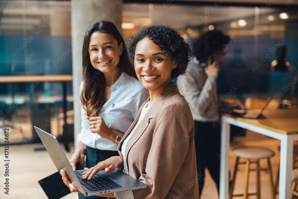 In a stylish, modern office workspace, two smiling women are actively collaborating and working together on a laptop