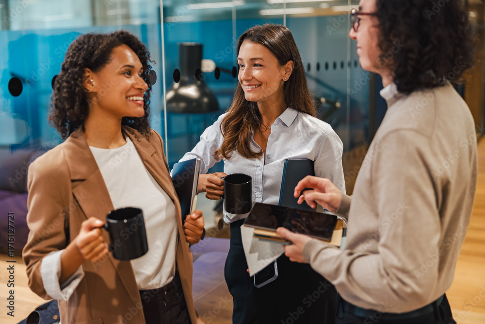 In a modern office, three colleagues enjoy a lively discussion while sipping coffee from their mugs