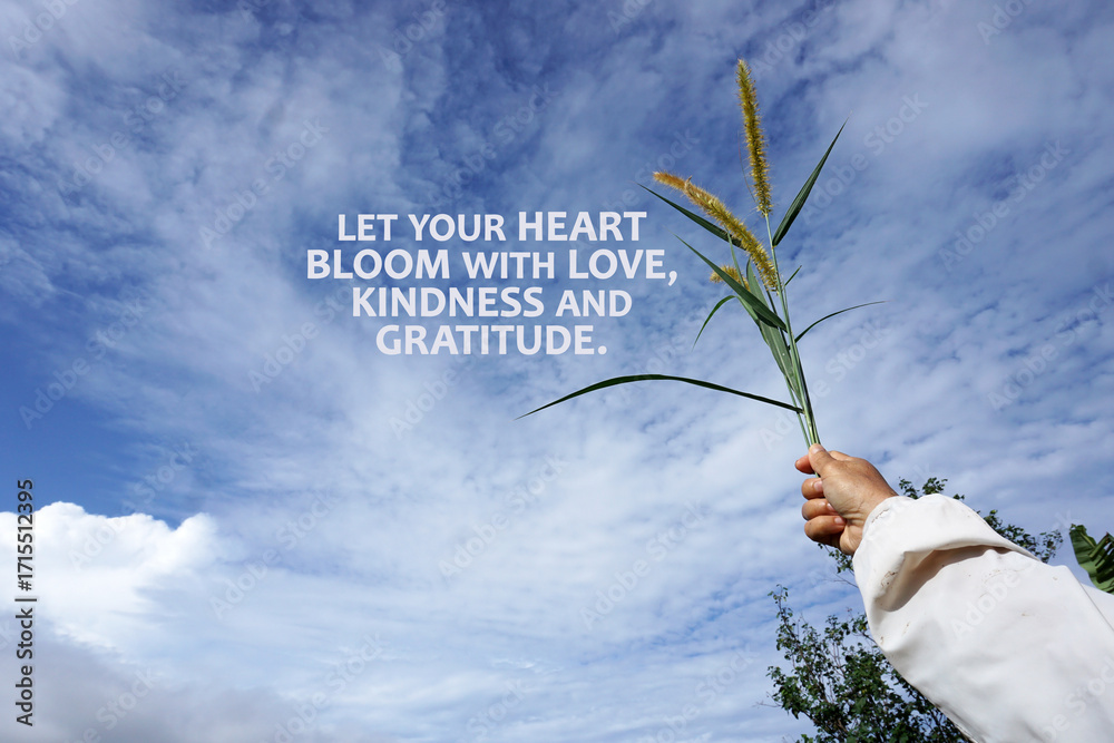 Inspirational motivational quote - Let your heart bloom with love, kindness and gratitude. With person holding wild grass flower in hand against the blue sky with clouds. Self love care concept.
