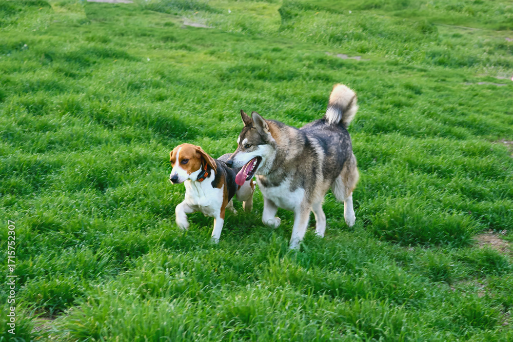 Domestic dogs, friends Beagle and Laika leisurely stroll through the green grass.