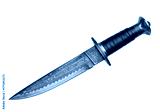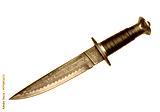 Isolated ornate dagger with a black leather wrapped handle with bronze accents and engraving