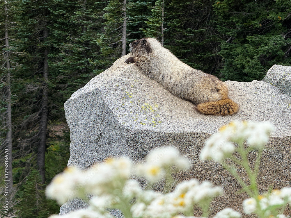 岩の上で日光浴をする白髪マーモット、マウントレーニア国立公園、8月下旬撮影