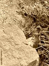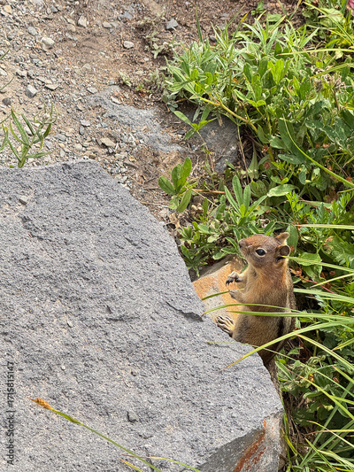 草の茂みから顔を出したシマリス、レーニア山国立公園、8月下旬撮影