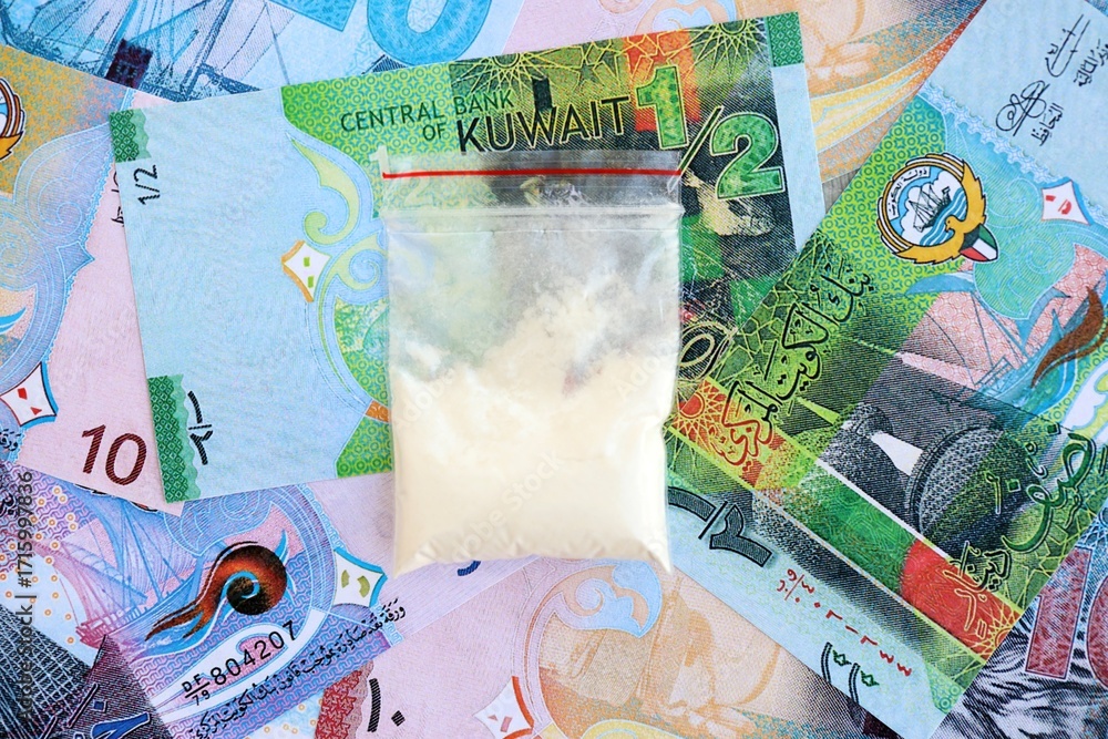 Kuwaiti dinar currency money bills and cocaine pack. The concept of drug trafficking