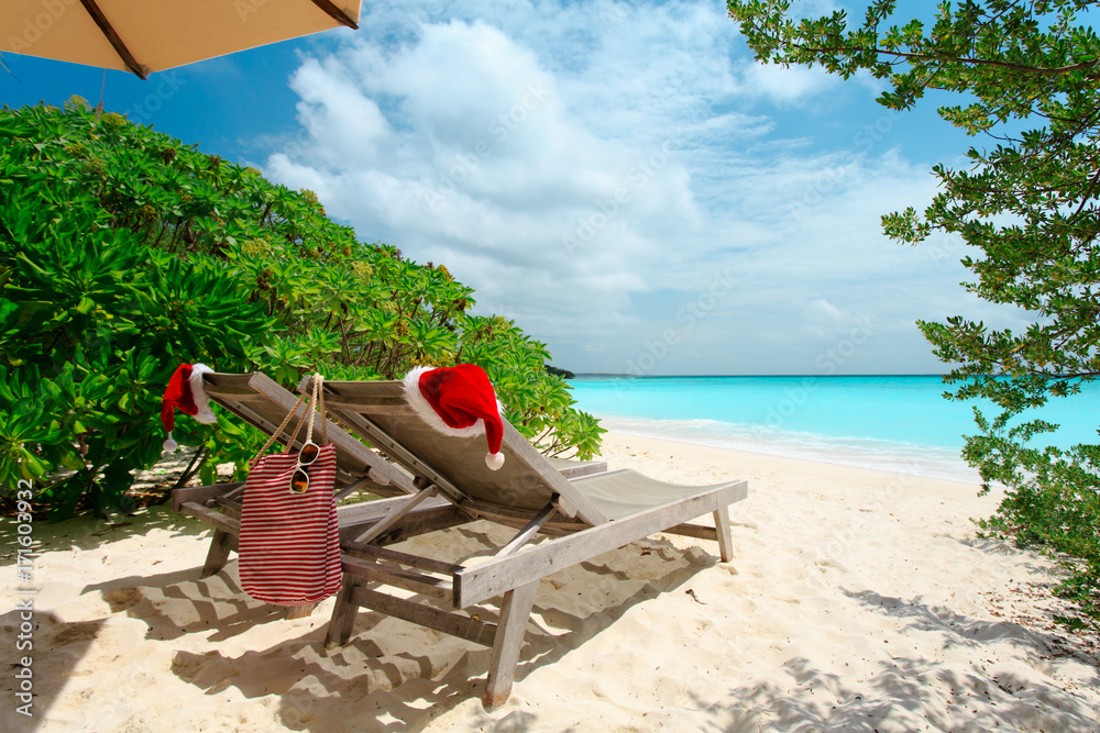 Christmas on beach -chair lounges with Santa hats at sea
