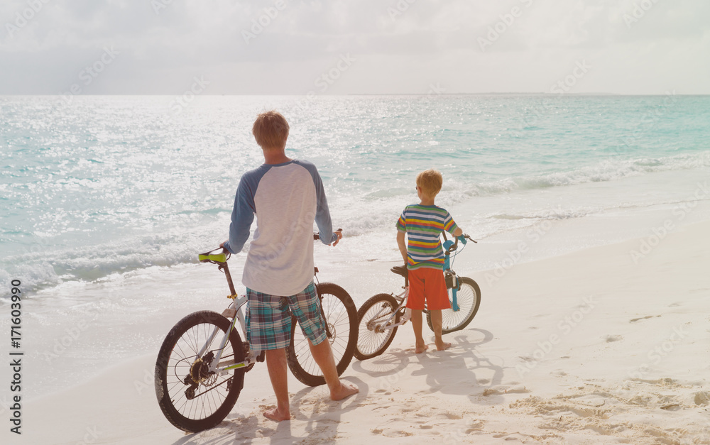 father with son and biking on tropical beach