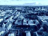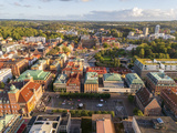 Borås, Sweden, aerial panoramic view of the city, with its main square, river, park and colorful buildings, early autumn, at sunset