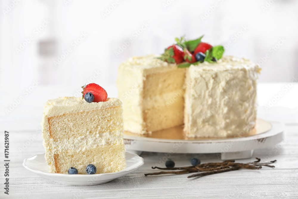 Sliced delicious vanilla cake with fresh berries on wooden table