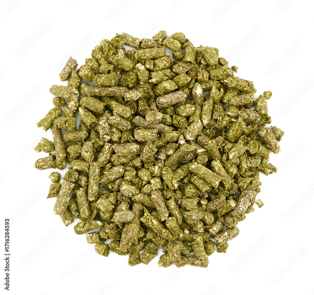 flat lay pile of green timothy grass pellet for rodent pet food feed cutout