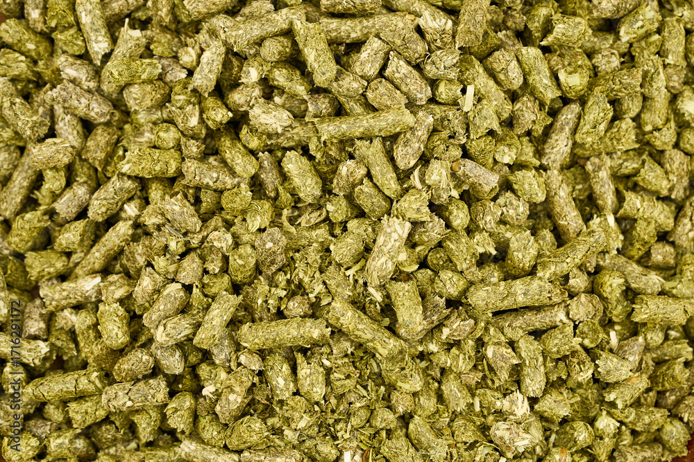 flat lay pile of green timothy grass pellet for rodent pet food feed texture background