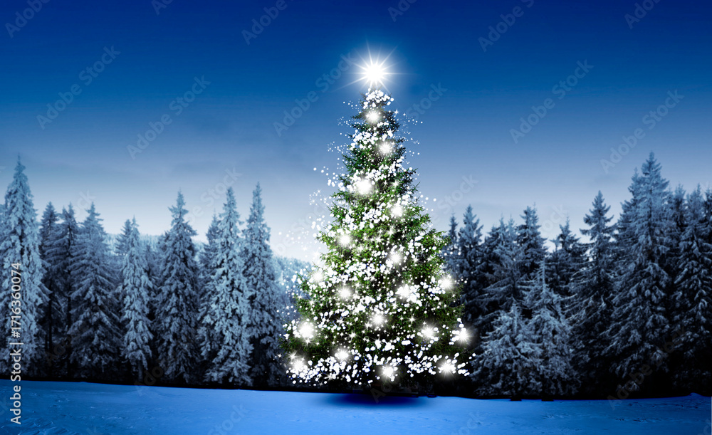 Beleuchteter geschmückter Weihnachtsbaum in einem verschneiten Winterwald