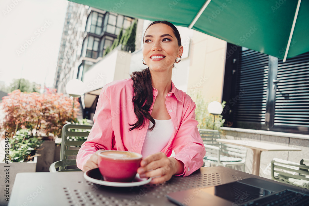 Lovely woman enjoying a coffee in an outdoor urban café on a sunny day, wearing a pink shirt and smiling confidently.