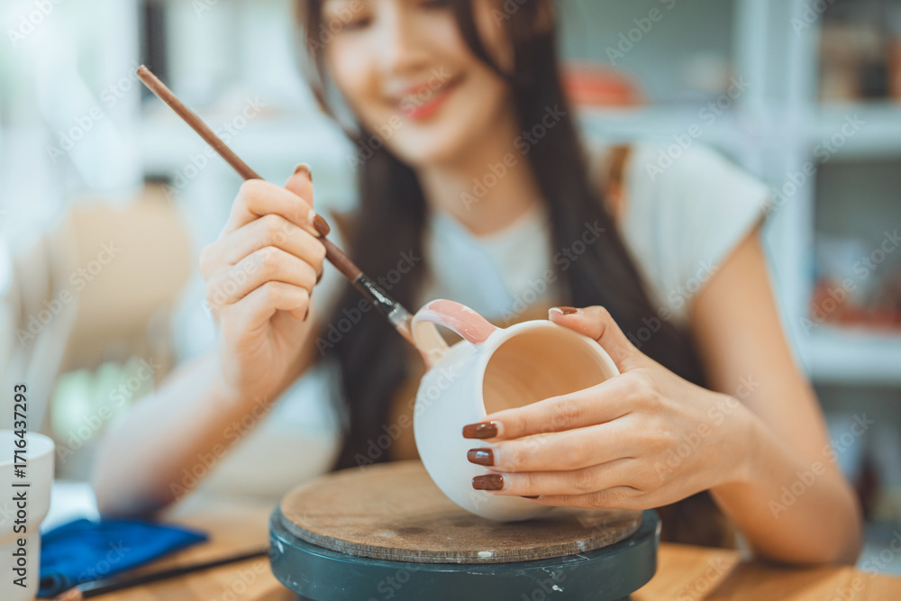 Asian woman painting ceramic art and pottery designs in her studio – happy artisan potter sitting with handmade tools, enjoying sculpting process and creative small business lifestyle