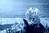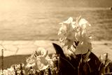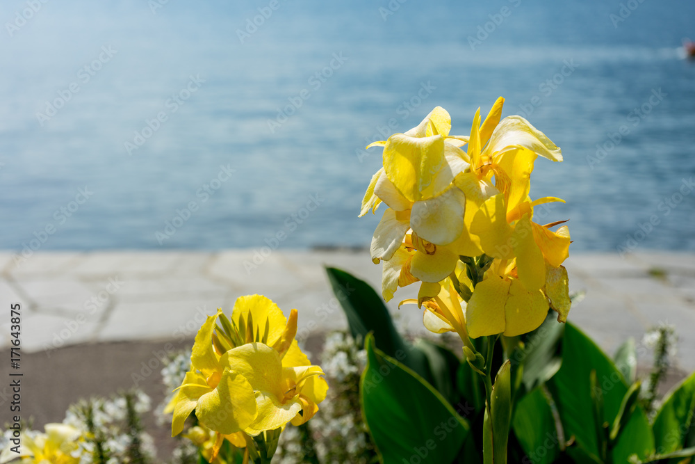 yellow flower in front of lake with boat sailing and water reflections in ascona lago maggiore