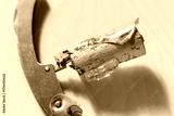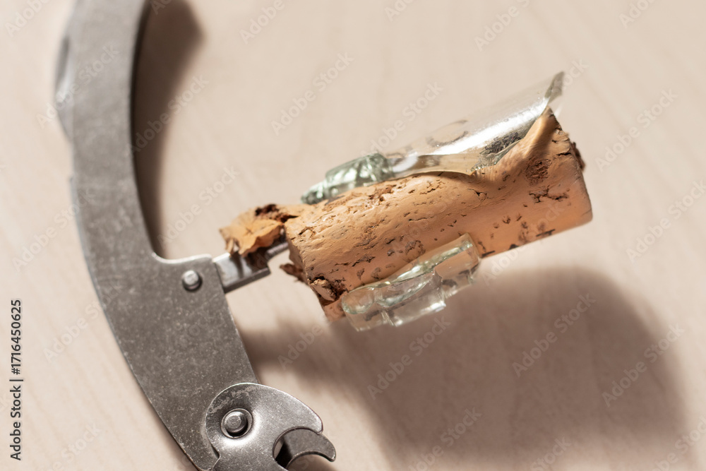 Corkscrew and cork in a broken bottle neck. Close-up.