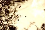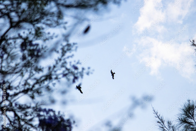 Couple of birds flying near tree against a background of a cloudy sky