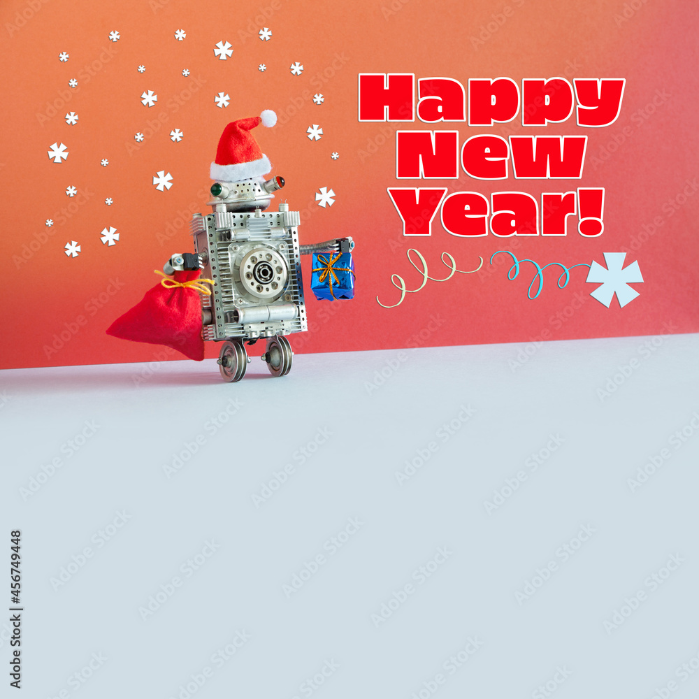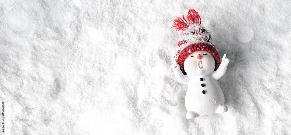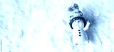 One little snowmen in caps on snow in the winter. Background with a funny snowman. Christmas card.