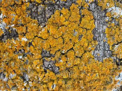 Close-up of yellow lichen growing on rough tree bark. Bright orange-yellow lichens form textured organic patterns against dark gray bark, showing natural detail and forest ecosystem beauty.