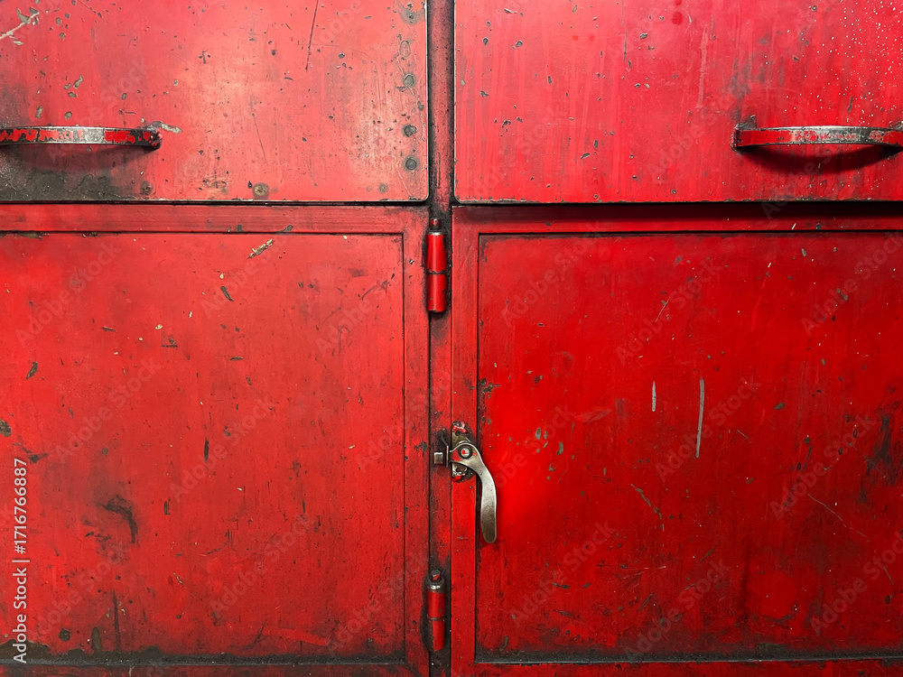 Old red metal cabinet door with scratches, peeling paint and rustic texture. Industrial vintage background for grunge design, workshop atmosphere, aged steel surface and construction detail.