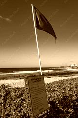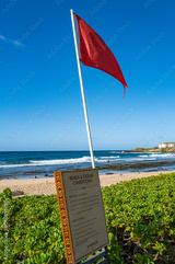 Ocean conditions informational sign and red warning flag signaling hazardous ocean conditions at Shipwreck Beach, in the Poipu area of Kauai, Hawaii, U.S.