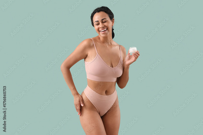 Young African-American woman in underwear with stretch marks and jar of cream on green background