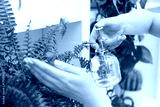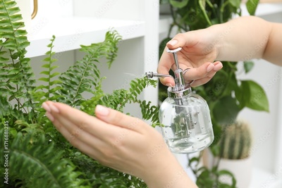 Young woman spraying beautiful houseplant with water from bottle indoors, closeup