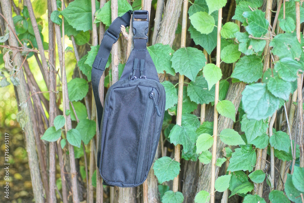 One black gray fabric handbag hangs on a branch of a bush with green leaves on a summer street