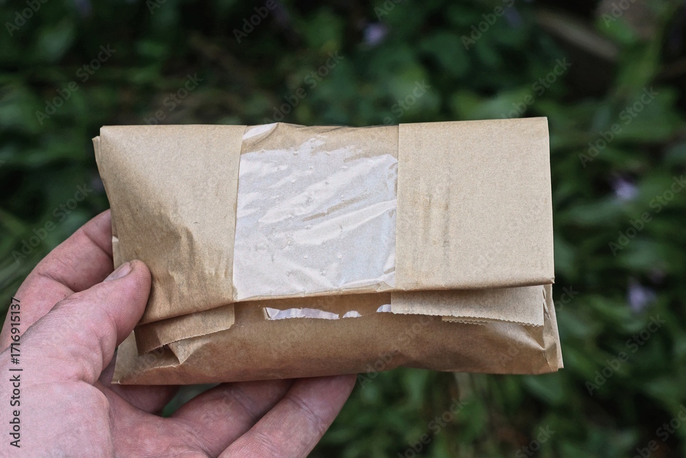 one hand holding one closed brown paper bag on a green background on a summer street