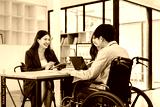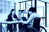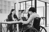 Young man in wheelchair collaborating with two colleagues at table disability teamwork meeting laptop notebook conversation focused professional