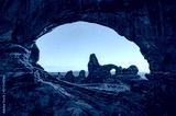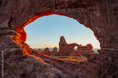 Stunning view of Turret arch through the North Window during sunset in Arches National Park near Moab in Utah, Southwest USA