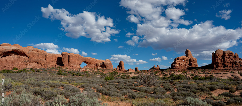Panoramic view of North Window and Turret arch on a sunny day at Arches National Park near Moab in Utah, Southwest USA.