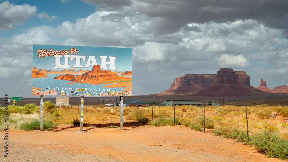 Welcome to Utah sign off the highway on the Arizona-Utah border with monument valley desert landscape behind.